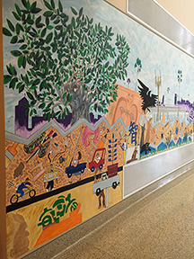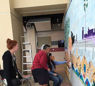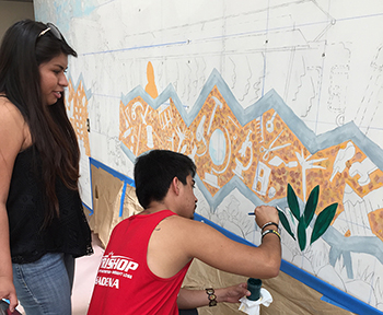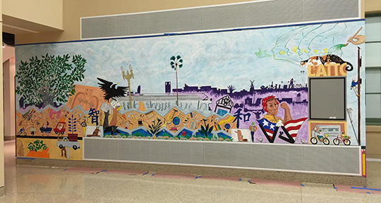 This mural was conceptualized by alumnus and artist, Leo Limón. He received his certificate in “Sign Graphics” at LATTC in 1980. Since then, his work has been shown worldwide and collected by several institutions, including the Smithsonian. The artist was invited to return to LATTC to create this mural for the 90th anniversary. Students and faculty contributed to this mural by helping Limón paint throughout April of 2015. There are many symbols in the mural that all represent the school’s past, present, and connection to the community and people of downtown Los Angeles. Each symbol tells a beautifully diverse story and demands a closer look. From the globe, to the hammer, to the pincushion, Limón added images of the different tools that students use at school and later in their careers.