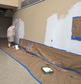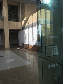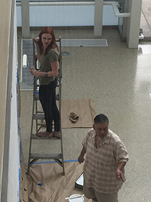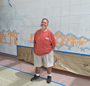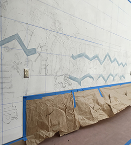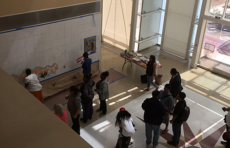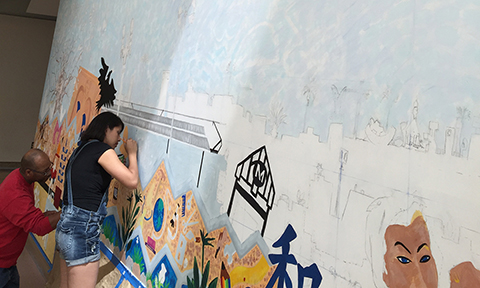 The artist was inspired by what he saw on campus and around the community. The purple skyline that runs throughout the middle of the mural includes “City Hall” and other buildings in downtown Los Angeles that can be seen throughout campus. Limón also added the Metro Blue Line along the middle of the mural. The metro runs right past LATTC and thanks to student efforts, the stop is now named after the school. In addition to sight, Limón infused his imagination into the mural. Below the Blue Line are silhouettes of faces. The artist painted them so that they were facing in opposite directions. The faces symbolize the students who have come in and out of the school throughout the years.