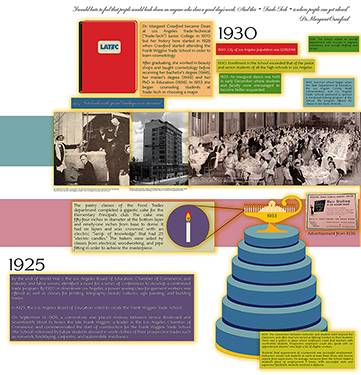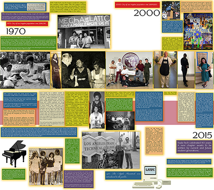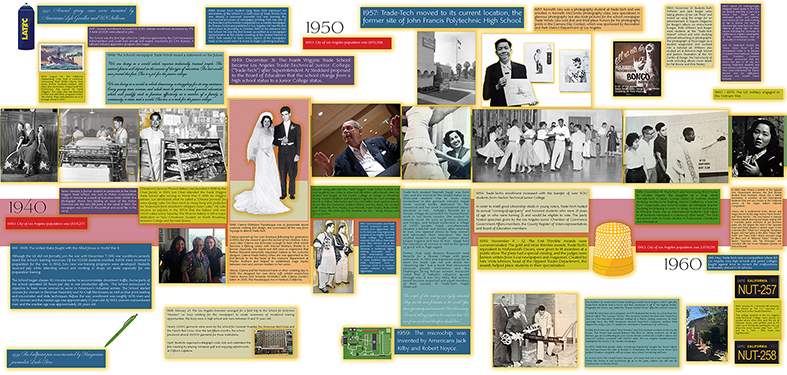 begins in 1920 and ends in 2015 and is student-centered approach to the history of LATTC. Using photographs from alumni and from the school's archive, this exhibit uses a linear approach to show change over time and to take advantage of the long corridor. The timeline profiles a dozen students over time and how their diverse and celebrated careers began at LATTC. The timeline shares stories of survival, struggle and success and how the school adapted to the changing needs of the nation and student body. |