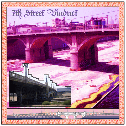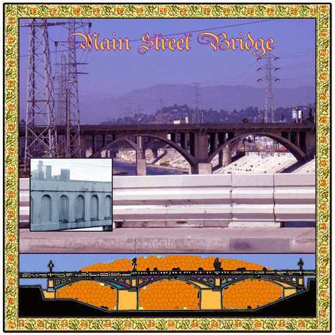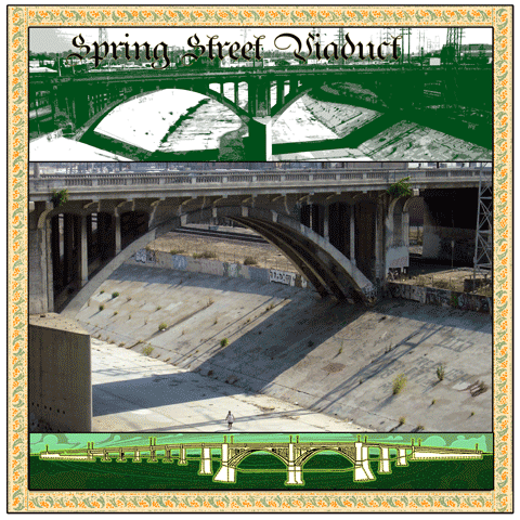 Spring Street Viaduct 1928 Upon reaching this area in 1769 Gaspar de Portala describes it as: "a lush spot with tall trees, abundant water and plentiful game." In short, the perfect place to build a pueblo for Spain's colony. The Spring Street Viaduct is built in 1928 and becomes a bypass route acrosss the Los Angeles River for commercial traffic traveling on Santa Fe and Alameda Streets. Today, Farmlab and the Metabolic Studio under the Spring Street Bridge provide creative and provocative talks by artists and researchers interested in land use issues. |