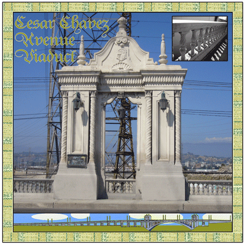The Cesar Chavez - Macy Street Bridge is first proposed in 1913 by the City Engineer to the Board of Public Works, who recommends his plan despite the construction's damage to Stern's Winery and the Agricultural Chemical Works. The Bridge is designed in a Spanish Colonial Revival style as it is located on the original El Camino Real. The Bridge is originally dedicated to mission founder Father Junipero Serra and it is originally called the Macy Street Bridge. It is renamed in honor of Cesar Chavez--co-leader of the United Farm Workers and Mexican American activist who used nonviolent means to reach his goals. |