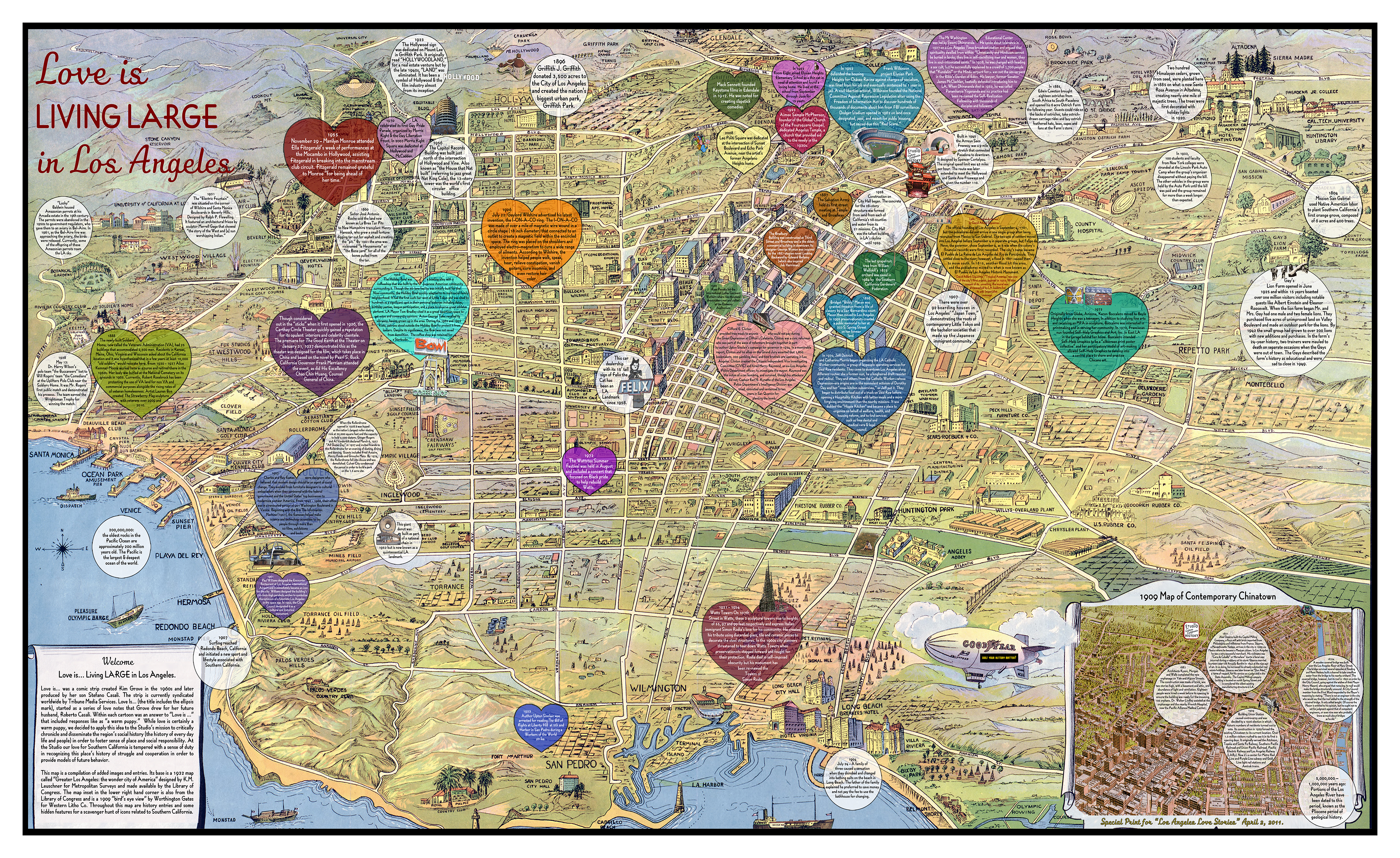 The map is a compilation of added images and entries. Its base is a 1932 map called “Greater Los Angeles: the wonder city of America” designed by K.M. Leuschner for Metropolitan Surveys and made available by the Library of Congress. The map inset in the lower right hand corner is also from the Library of Congress and is a 1909 “bird’s eye view” by Worthington Gates for Western Litho Co. Throughout this map are history entries and some hidden features for a scavenger hunt of icons related to Southern California. |